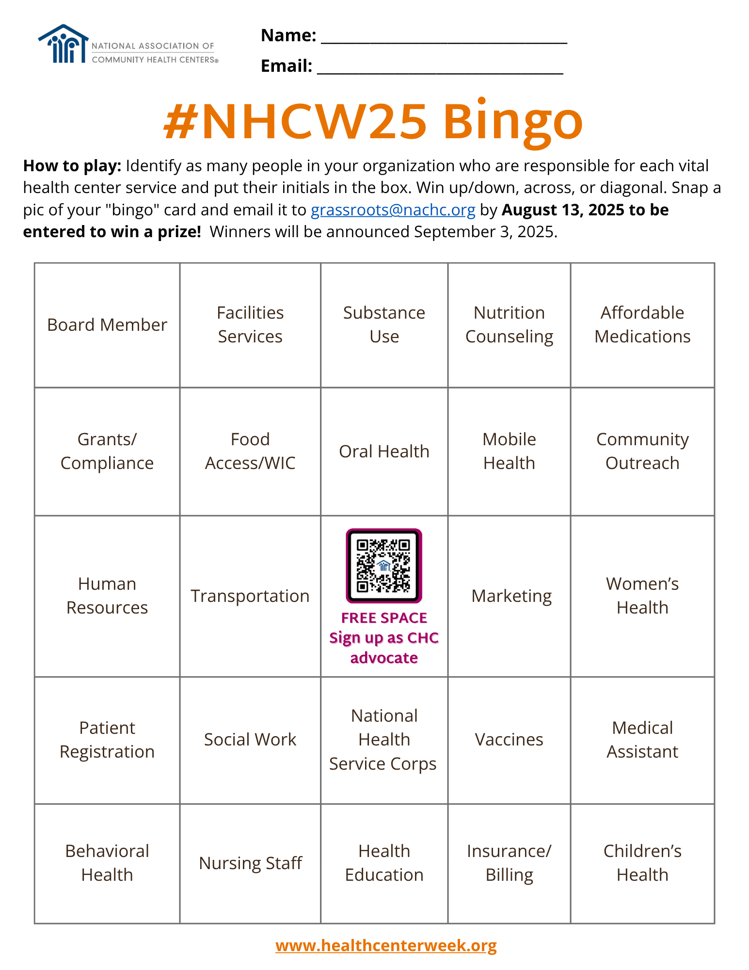 - Email your a copy of your completed bingo card to grassroots@nachc.org no later than August 13, 2025.